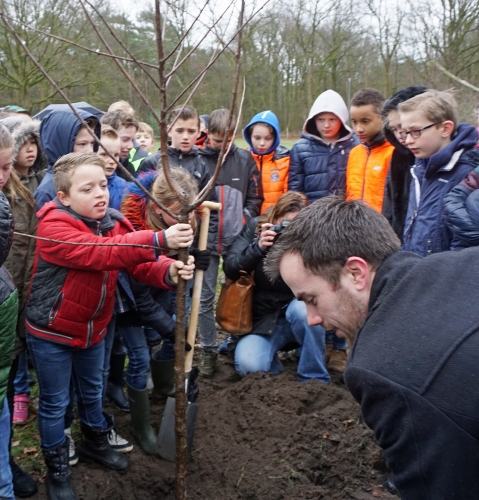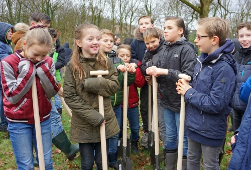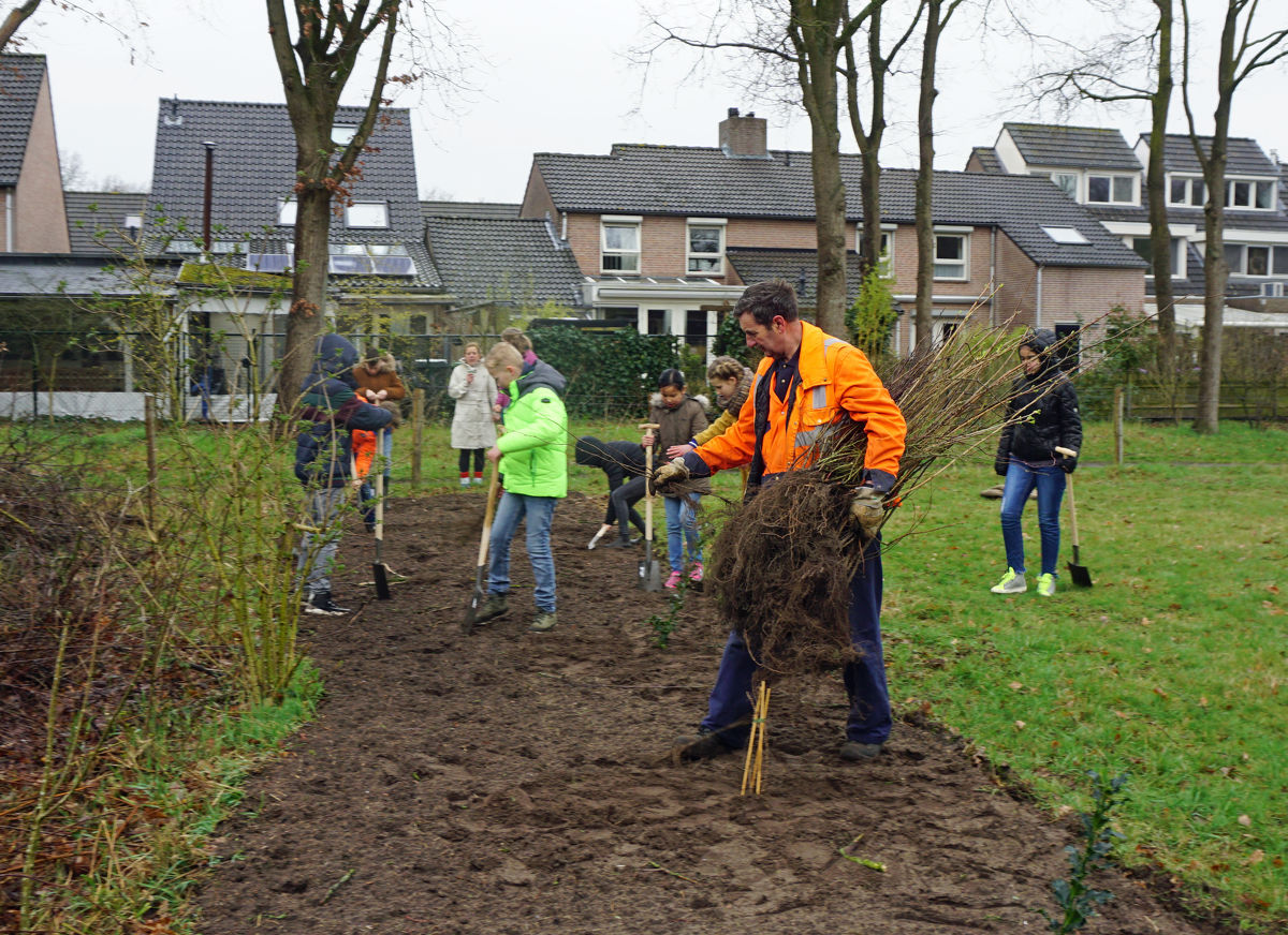 De kinderen planten de bomen op de groene weides langs de Oude Baan in de wijk Sparrenburg.