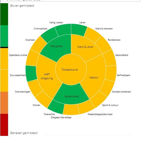 De uitkomsten worden gepresenteerd aan de hand van zogenaamde profieltaarten. Door deze profieltaarten kunt u in één oogopslag zien hoe een wijk, dorp of buurt ervoor staat. De kleuren in de profieltaart laten zien hoe een wijk of buurt ervoor staat. De profieltaart voor de situatie 2022 laat zien of een wijk of buurt bovengemiddeld, gemiddeld of beneden gemiddeld scoort. De profieltaart voor de ontwikkeling tussen 2020 en 2022 laat zien of een wijk of buurt in die twee jaar vooruit is gegaan, ongeveer gelijk is gebleven of achteruit is gegaan. De profieltaart bestaat uit vijf thema’s: werk & leren, welzijn, samenleven, leefomgeving en veiligheid. Ieder thema bestaat weer uit een aantal deelthema’s.