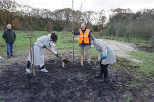 (op de foto twee dochters van Jos van Son met Helmus Boons van Stichting Levenbomenbos)