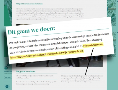 Een jaar lang heeft Werkgroep Kindvriendelijk Sparrenburg zich heel intensief ingezet voor behoud van de basisschool en kinderopvang in de wijk. We zijn heel blij dat er nu duidelijkheid is en in het bestuursakkoord van de nieuwe coalitie van de gemeente staat: “Nieuwbouw van kindcentrum Sparrenbos landt midden in de wijk”