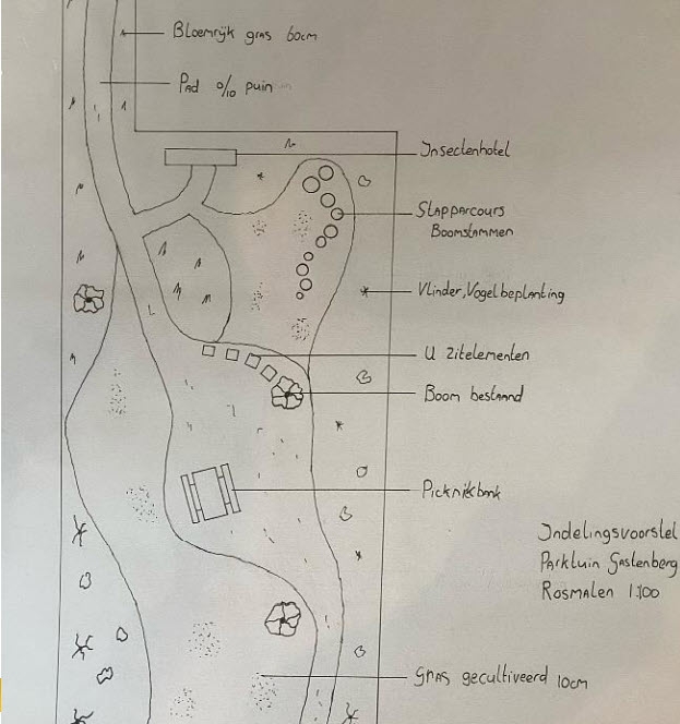 Drie initiatiefnemers uit de buurt hebben samen met een tuinman een nieuw ontwerp gemaakt. Bloemrijke grassen als voedsel- en schuilplekken voor onder meer bijen en vlinders zullen centraal staan in het nieuwe ontwerp. Er zal een speels verbindings-pad lopen tussen de straat en er is ruimte voor ontmoeten en ontspannen met bankje en zitelementen onder de prachtige bomen die er staan.