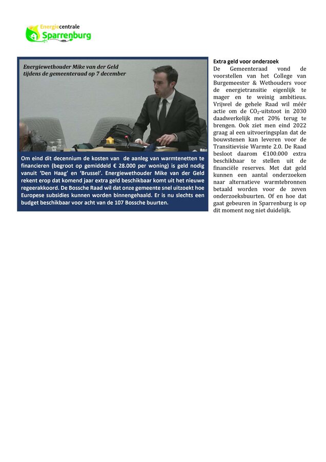 e Gemeenteraad vond de voorstellen van het College van Burgemeester & Wethouders voor de energietransitie eigenlijk te mager en te weinig ambitieus. Vrijwel de gehele Raad wil méér actie om de CO2-uitstoot in 2030 daadwerkelijk met 20% terug te brengen. Ook ziet men eind 2022 graag al een uitvoeringsplan dat de bouwstenen kan leveren voor de Transitievisie Warmte 2.0. De Raad besloot daarom €100.000 extra beschikbaar te stellen uit de financiële reserves. Met dat geld kunnen een aantal onderzoeken naar alternatieve warmtebronnen betaald worden voor de zeven onderzoeksbuurten. Of en hoe dat gaat gebeuren in Sparrenburg is op dit moment nog niet duidelijk.