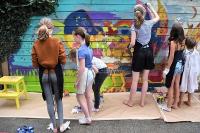 De Zomercamping werd met het jaarlijkse straatfeest afgesloten met niet alleen een barbecue maar ook een creatieve activiteit: met vele kleine en grote mensen werd een prachtige schildering gemaakt van de Tielietielie-vogel.
